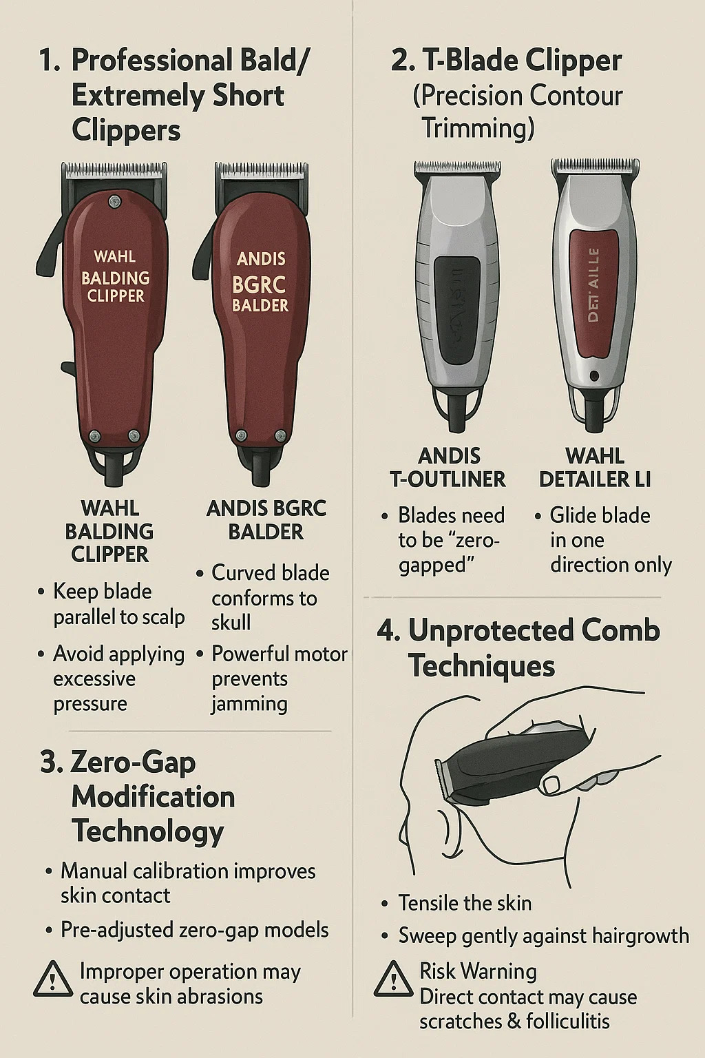 Para o corte de cabelo mais próximo do couro cabeludo, os seguintes tipos de máquinas de cortar cabelo e técnicas podem conseguir um corte mais próximo de uma navalha, exigindo uma combinação de características da ferramenta e habilidades operacionais: